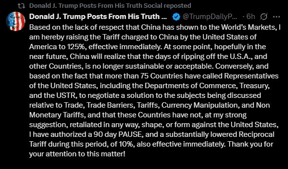 다만 이날 발표에서 중국에 대한 관세는 오히려 125%까지 인상되면서 시장에는 여전히 불안감이 남겨졌다. 트럼프 대통령은 트루스소셜에서 "중국이 세계시장에 보여준 존경심 부족에 근거해 중국에 대한 관세를 즉시 125%로 인상한다"고 밝혔다. 베센트 장관도 중국을 제외한 모든 국가와 협상이 진행됐다고 말했다.