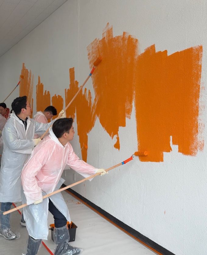 이 후보는 10일 오전 서울 서초구 강남역 인근 한승빌딩 대선 캠프에서 '강남 캠프, 오렌지로 컬러링' 행사를 진행했다. 이 후보와 개혁신당 지도부는 캠프 공간 흰색 내벽을 오렌지색 페인트로 칠했다.