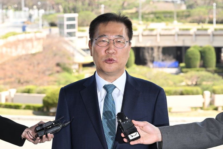 탄핵안 기각으로 직무 복귀한 박성재 법무부 장관이 10일 경기 과천 법무부 청사로 출근하고 있다. 고운호 기자 |