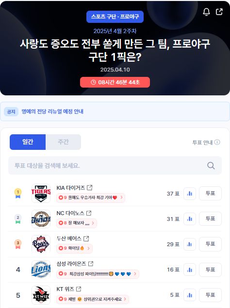 그럼에도 불구하고 팬들의 응원은 식지 않았다. 10일 오후 3시 13분 기준 삼성 라이온즈는 디시트렌드 일간 투표 '사랑도 증오도 전부 쏟게 만든 그 팀, 프로야구 구단 1픽은?' 부문에서 16표를 얻으며 4위를 기록했다. 아쉬운 패배 속에서도 팬심은 여전히 뜨거운 가운데, 삼성은 타선의 반등을 통해 상위권 경쟁 재점화를 노리고 있다.