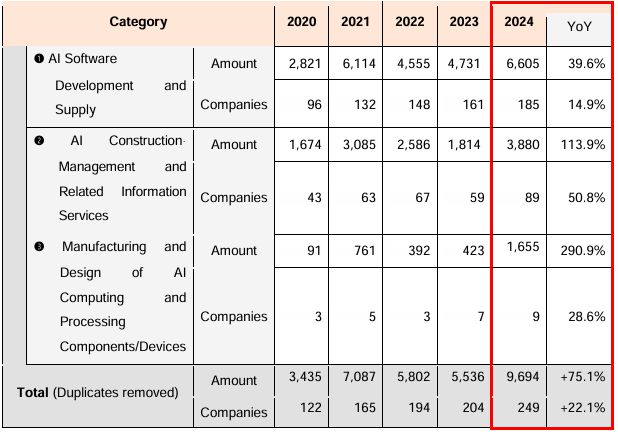 Within the AI ecosystem, companies focused on software development received the largest share of funding. However, investments in AI infrastructure services and computing hardware manufacturing surged dramatically, growing by 113.9 percent and 290.9 percent respectively.