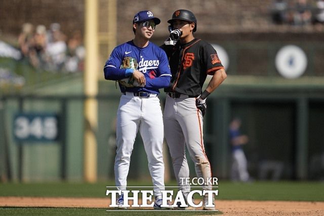 이정후(오른쪽)가 메이저리그에 안착한 반면 김혜성은 험난한 길을 걷고 있다. 올해 시범경기에서 만난 둘이 이야기를 나누고 있다. /뉴시스