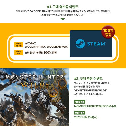 또한 마이크로닉스는 '우드 페스타' 프로모션을 진행한다. 우드리안 시리즈 구매 후 영수증을 응모하면 스팀 월렛 1만 원권이 전원에게 증정되며, 추첨을 통해 5명에게는 '몬스터 헌터 와일즈' 게임 교환 코드가 추가 제공된다. 포토 상품평을 작성하고 응모할 경우, 한정 수량 50명에게 EZDIY-FAB SHIELD ATX 24핀 ARGB 어댑터도 함께 증정된다.