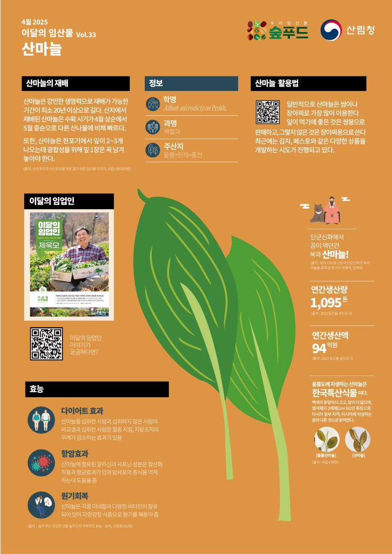 박은식 산림청 산림산업정책국장은 "산마늘은 항산화 성분과 면역 강화 효과가 뛰어난 우리 숲의 보물 같은 임산물"이라며 "우리 임산물의 우수성을 널리 알리고 국민들의 건강한 식생활에 보탬이 되도록 노력하겠다"고 말했습니다.