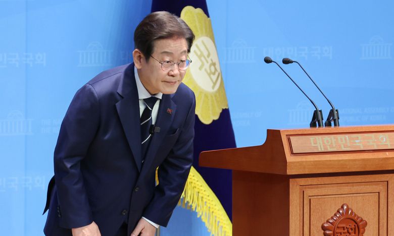 제21대 대통령선거에 출마를 선언한 이재명 더불어민주당 전 대표가 11일 서울 여의도 국회 소통관에서 기자회견을 열고 비전 및 캠프 인선을 발표하고 있다. 뉴스1