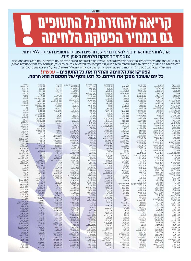 이스라엘 전현직 공군 장병 970명이 이스라엘 대표 일간지들에 게재한 전면 광고. 붉은색 제목으로 "적대 행위 중단을 통한 납치 피해자(인질)의 귀환을 촉구한다"고 되어 있다. /일간 하욤 제공 |