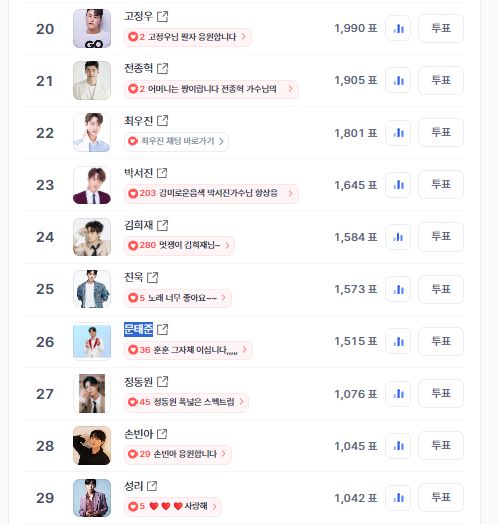 [스타데일리뉴스=정상훈기자] 웹소설 작가이자 트로트 무대에 도전한 문태준이 11일 오후 1시 51분 기준 4월 2주차 디시트렌드 '그의 트로트, 마음을 울려버린다!' 주간 투표에서 1,515표를 획득하며 26위에 올랐다. 자가면역 질환과 싸우며 무대 위에서 진심을 노래한 그의 이야기가 많은 이들의 마음을 움직였다.