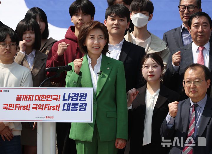 나 의원은 이날 연두색 정장 차림 연단에 섰다. 그는 국회 본관 계단을 덮는 대형 태극기 앞에서 지지자들과 함께 출마 선언을 했다.