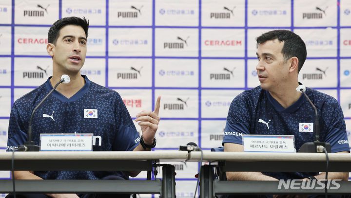 [서울=뉴시스] 김진아 기자 = 이싸나예 라미레즈 대한민국 남자배구 국가대표팀 감독이 지난해 25일 오전 서울 송파구 올림픽파크텔에서 열린 '대한민국 배구 국가대표팀 신임 감독 기자회견'에서 질문에 답하고 있다. 오른쪽은 페르난도 모랄레스 대한민국 여자배구 국가대표팀 감독. 2024.04.25. bluesoda@newsis.com |