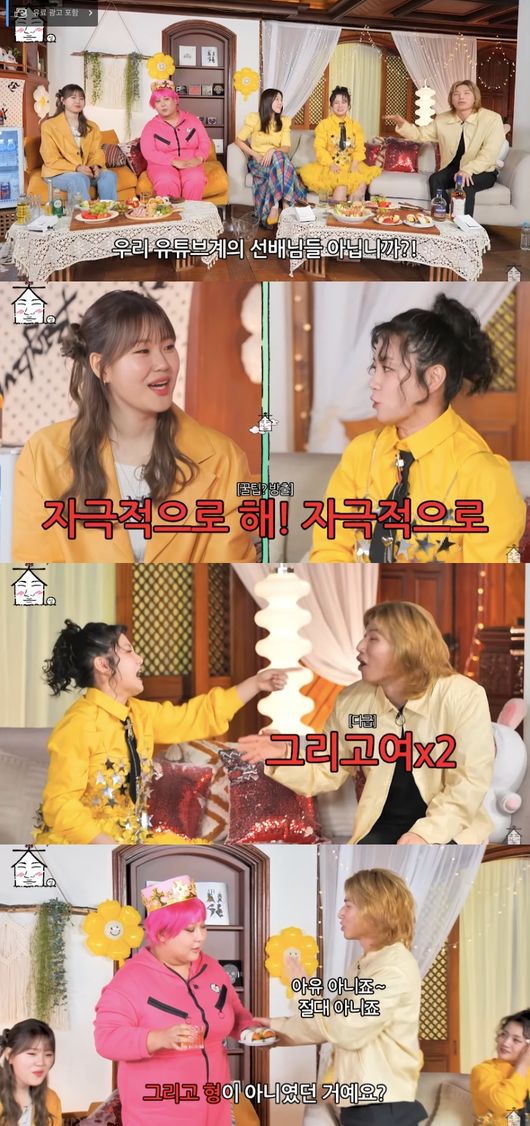 이때 풍자는 “유튜브에 노란딱지가 안 되면 빨간 딱지가 붙는다”라고 했고, 한혜진은 “저희가 한번 붙여 드릴까요? 노란 거?”라고 거들었다. 멤버들은 단체로 벗을 준비를 했고, 대성은 “해주세요. 우리끼리 보면 되잖아”라며 풍자를 향해 “그리고 형 결국에”라고 말실수를 했다.