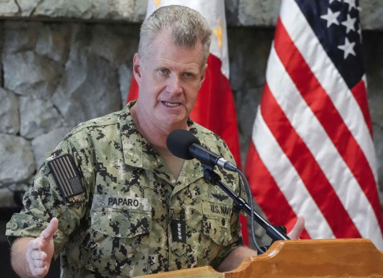 새뮤얼 퍼파로 인도태평양사령관이 지난해 8월 29일 필리핀 북부 바기오의 필리핀 육군사관학교에서 가진 기자회견에서 답변하고 있다. 바기오(필리핀)=AP 뉴시스