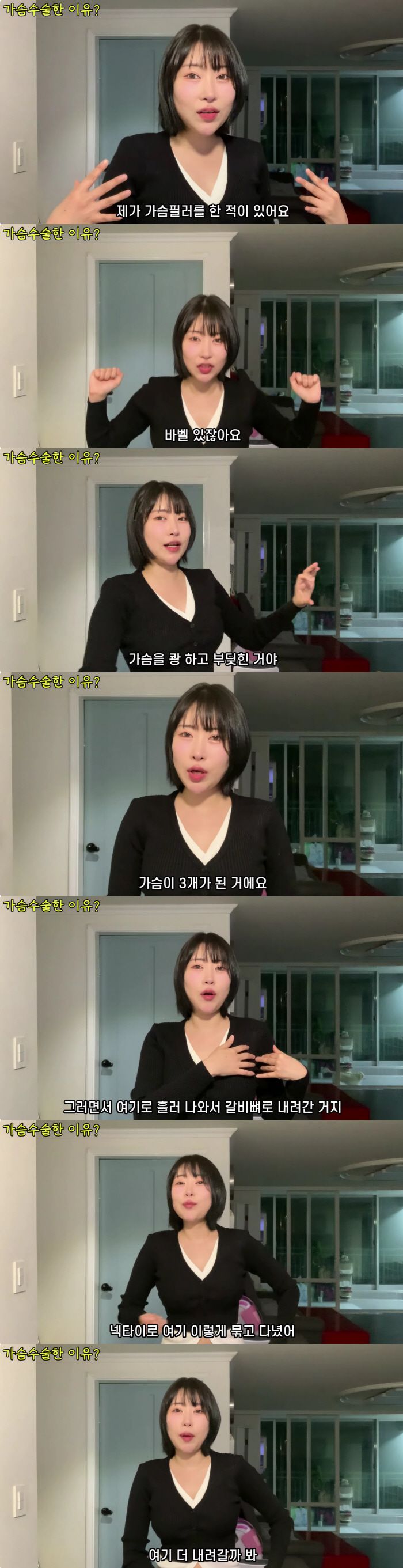 그는 "가슴이 세 개가 됐더라. 가슴은 원래 두 개여야 하지 않냐. 가슴 아래 가슴이 하나 더 생겼다. 눈을 막 비비면서 '이게 무슨 일이야'하고 봤는데, 필러 넣었던 가슴이 사라진 거다. 가슴에 상처 나서 필러가 흘러 내려 갈비뼈로 내려온 거다"라고 아찔했던 당시를 떠올렸다.