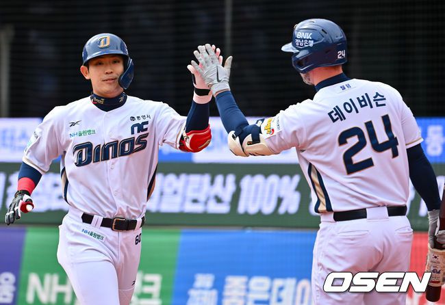 NC 다이노스 박한결이 1회말 2사 2루 좌월 2점 홈런을 치고 하이파이브를 하고 있다. 2025.04.13 / foto0307@osen.co.kr