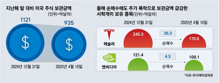 서학개미 매수세에도 국내 투자자의 미국 주식 보유금액이 올해 25조원 넘게 줄어들었다. 국내 투자자들이 주로 사들이고 있는 테슬라와 엔비디아부터 각종 레버리지 상품 주가가 순매수 규모를 넘어설 만큼 빠지면서 서학개미의 잔액은 1000억달러가 무너지며 급속히 쪼그라들고 있다.
