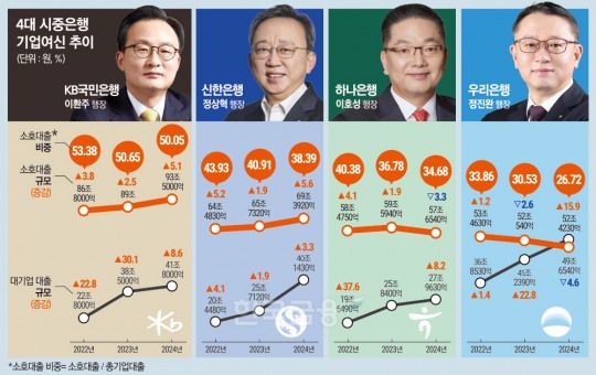 기업여신 내 소호대출 비중의 경우 2023년 42.27%에서 지난해 39.66%로 줄었지만, 대기업 대출과 중소기업 대출이 고루 늘어난 '효과'였다.