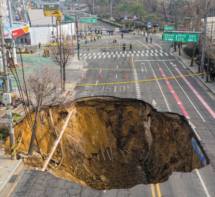 13일 오전 8시 50분쯤 서울 마포구 지하철 5호선 애오개역 앞 차로에서 지름 40cm, 깊이 1.3m 규모의 싱크홀(땅 꺼짐 현상)이 발생해 7시간 40여분 동안 일부 차선이 통제됐다. 앞서 지난 2일 서울 강동구 길동 신명초등학교 인근 교차로에서도 가로·세로 20㎝, 깊이 50㎝ 싱크홀이 발견됐다. 지난달 24일 강동구 명일동에서 가로 18m, 세로 20m, 깊이 18m 규모의 대형 싱크홀이 발생해 1명이 사망한 곳으로부터 불과 980m 떨어진 곳이다. 그런데 지난 10일 강동구 길동역 1번 출구 앞에서 가로 50cm, 세로 1m, 깊이 5cm 규모의 도로 침하가 또 다시 발견됐다.