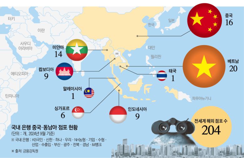 13일 금융감독원에 따르면 지난해 9월 말 기준으로 해외에 진출한 국내 은행 14곳의 현지 법인·지점·사무소 중 76곳이 중국과 동남아시아에 위치해 있다. 이는 전체 204곳의 약 37%에 해당한다.
