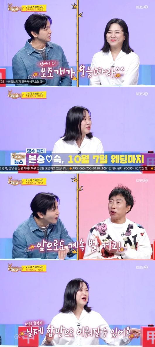구본승과 김숙이 묘한 기류를 형성하자 이순실은 “남편이냐”라고 물으면서 궁금증을 드러냈고, 박명수는 올 가을 결혼에 대한 의향을 물었다. 김숙은 “나는 오빠 의견을 따를 거다”라면서 구본승에 대한 특별한 마음을 내비쳤고, 이어 ‘본승♡숙, 10월 7일 웨딩마치’이라는 자막이 삽입돼 눈길을 끌었다.