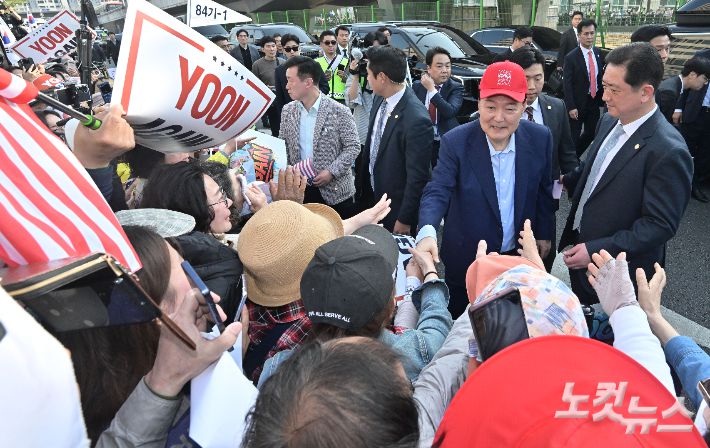 윤석열 전 대통령이 파면 선고 일주일 만인 11일 오후 서울 용산구 한남동 관저를 떠나며 지지자들에게 인사를 하고 있다. 류영주 기자