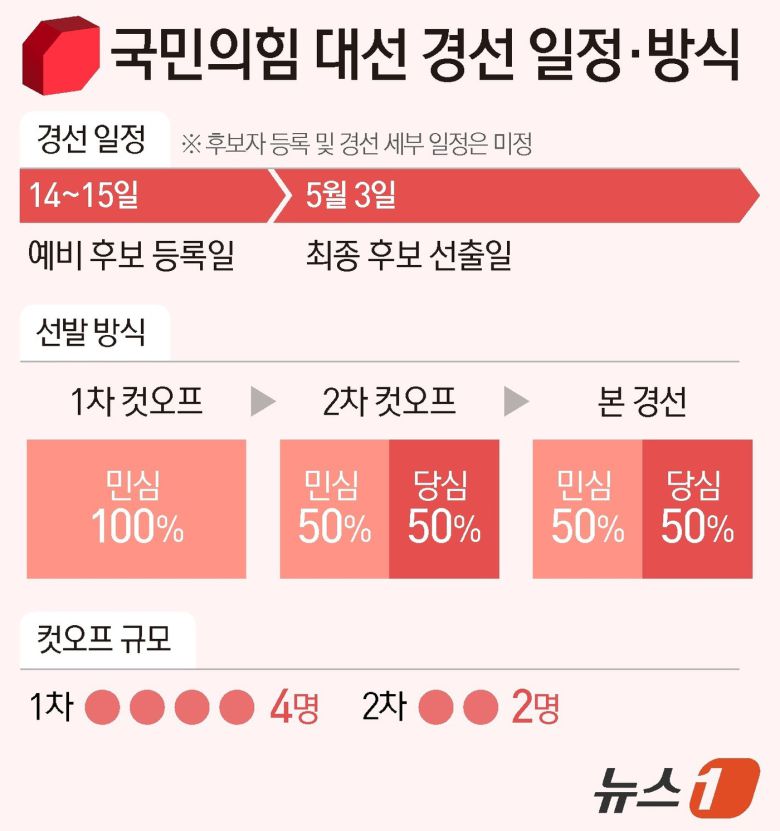 (서울=뉴스1) 양혜림 디자이너 = 국민의힘이 이번 주부터 대선 후보 선출을 위한 경선 일정에 본격 돌입한다. 당 선거관리위원회는 오는 14~15일 후보 등록을 받은 뒤 16일 서류심사를 거쳐 1차 경선 진출자를 확정할 예정이다. 1차 경선에서는 일반국민 여론조사 100%(4월 21~22일)로 후보 4명(22일 발표)을 추린다.