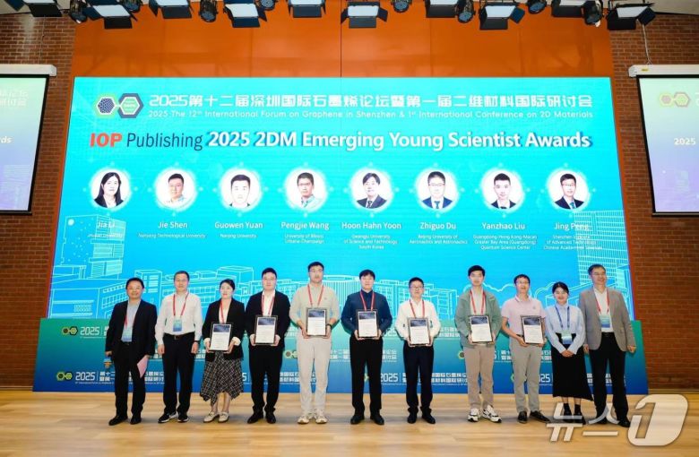 윤훈한 교수(왼쪽 여섯 번째)가 13일 중국 칭화대학교 국제대학원에서 열린 ‘'2025 2차원 물질 신진 젊은 과학자상' 시상식에서 수상자들과 기념촬영 하고 있다.(지스트 제공, 재판매 및 DB 금지) |