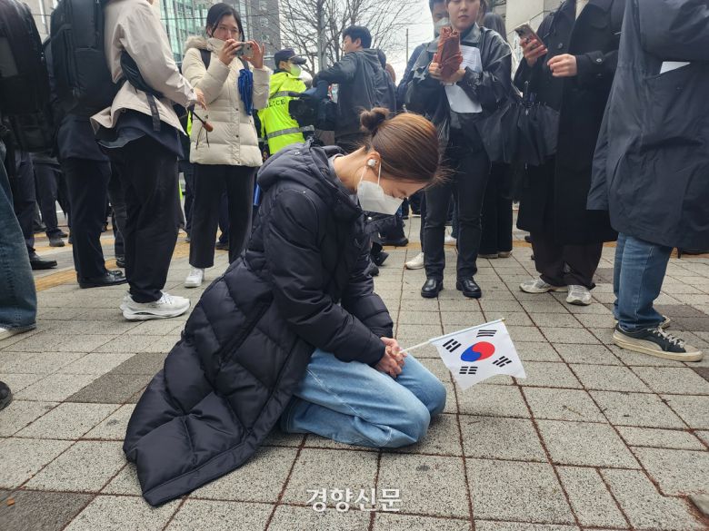 14일 윤석열 전 대통령의 첫 형사재판을 앞두고 서울 서초구 서울중앙지법 동문 앞에서 한 지지자가 무릎을 꿇고 기도하고 있다. 우혜림 기자
