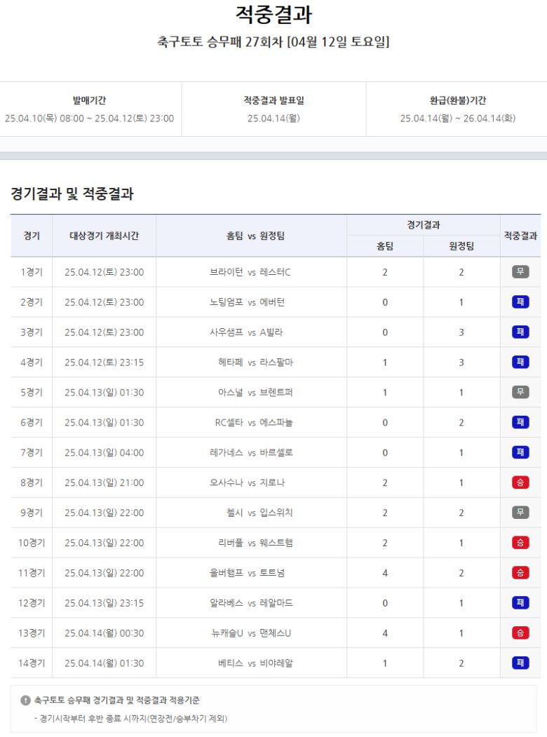 국민체육진흥공단이 발행하는 체육진흥투표권 스포츠토토의 수탁사업자인 스포츠토토코리아가 공식 인터넷 발매 사이트 베트맨을 통해 오는 10일부터 14일까지 진행된 축구토토 승무패 27회차의 적중 결과를 14일 발표했다.