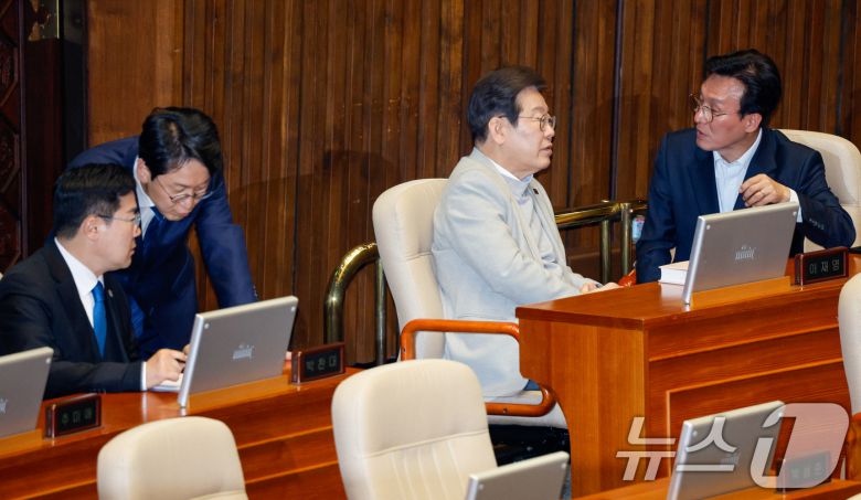 (서울=뉴스1) 안은나 기자 = 더불어민주당 박찬대 대표 직무대행 겸 원내대표(왼쪽부터)와 천준호 의원, 이재명 전 대표와 김민석 최고위원이 14일 오후 서울 여의도 국회 본회의장에서 정치·외교·통일·안보에 관한 대정부질문이 진행중인 가운데 대화하고 있다. 2025.4.14/뉴스1