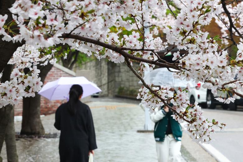 비가 내리며 쌀쌀한 날씨를 보인 14일 서울 한 대학교 캠퍼스에 벚꽃이 피어있다. 연합뉴스