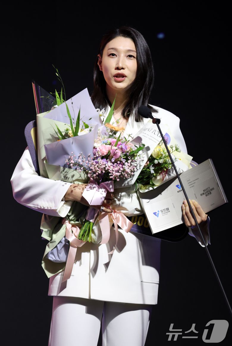 14일 오후 서울 서대문구 그랜드 스위스 호텔에서 열린 프로배구 '2024-2025 도드람 V리그' 시상식에서 여자부 베스트7 상을 수상한 흥국생명 김연경(아웃사이드히터)이 소감을 밝히고 있다. 2025.4.14/뉴스1 ⓒ News1 이승배 기자