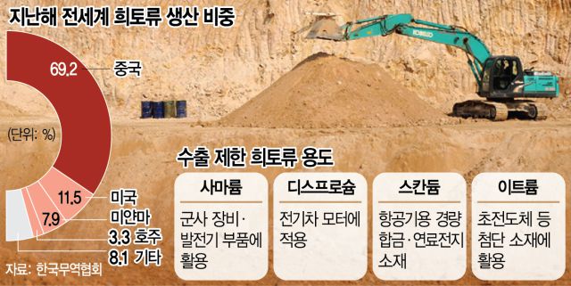 이들 희토류는 전기차 모터, 드론, 로봇, 미사일, 스마트폰, 인공지능(AI) 서버 등 전략산업의 핵심 소재로 꼽힌다. 특히 중국은 전 세계 희토류 생산의 60% 이상을 차지하고 정제·분리 공정에서는 90%의 점유율을 보유하고 있다. 희토류를 무기화해 미국뿐만 아니라 글로벌 공급망에도 치명타를 입힐 수 있다.