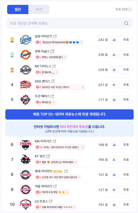 한편, 디시트렌드 스포츠구단 일간 투표에서는 SSG 랜더스가 221표를 기록하며 전체 4위를 유지했다. 팀 성적과 같은 순위를 기록 중인 가운데, 팬들의 응원 열기는 여전히 식지 않고 있다.