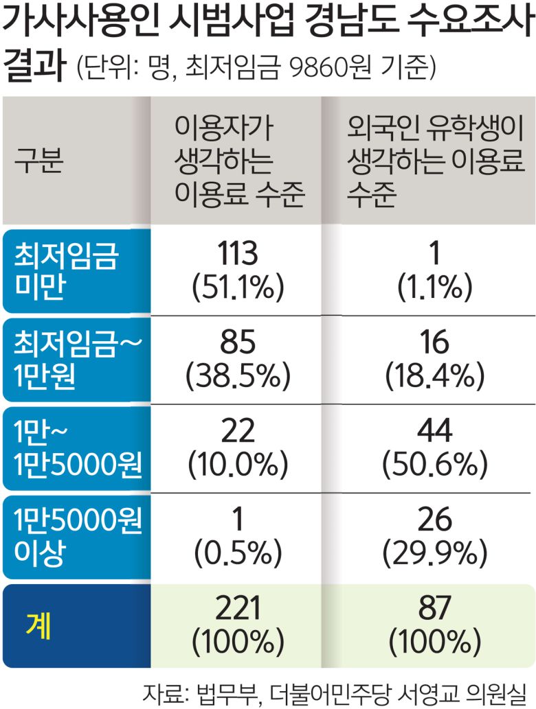 법무부와 전국 3개 지자체(서울시·경남도·전북도)가 최저임금법 적용을 받지 않는 ‘외국인 가사사용인’ 시범사업을 하겠다고 나선 가운데 참여 의사가 있는 외국인 유학생 중 ‘최저임금 미만이 괜찮다’는 비율은 1%에 불과한 것으로 확인됐다. 외국인 유학생 30%는 시간당 ‘1만5000원 이상’은 받아야 일할 의향이 있다고 밝히는 등 ‘임금 괴리’가 상당한 것으로 나타났다. 여러 논란에 전북도는 시범사업을 철회키로 했다.