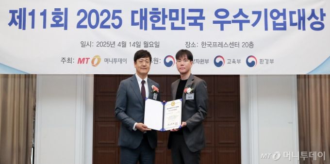 김도하 하울링 대표(사진 오른쪽)가 14일 오후 서울 중구 한국프레스센터에서 열린 머니투데이 주최의 '2025 제11회 대한민국 우수기업대상' 시상식에서 '도급직 인력관리 솔루션' 부문 '우수스타트업대상'을 수상하고 송기용 머니투데이 전무와 기념사진을 촬영 중이다.