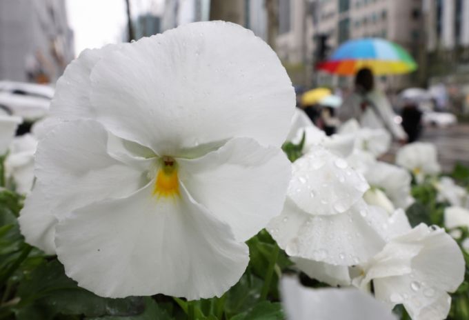 14일 서울 강남구 테헤란로 화단 팬지꽃에 빗물이 맺혀 있다./사진=뉴시스 |