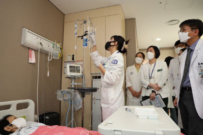 여의도성모병원 림프종센터 전영우 교수(맨오른쪽)가 CAR-T 주입 및 환자 상태를 살펴보고 있다.