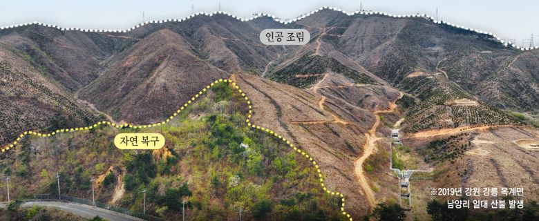 불과 2년 후인 2019년에는 마을 4곳에 1033㏊(10㎢)가 불타는 최악의 피해가 발생했다. 또다시 소나무림이 잿더미가 되자 ‘인공조림’과 ‘자연복구’를 둘러싸고 의견이 충돌했다. 산림청은 피해 지역 한쪽은 인공조림을, 다른 한쪽은 자연복구를 하기로 했다. 두 사례를 비교해 향후 산불 피해 복구 모델을 발전시키자는 취지였다.