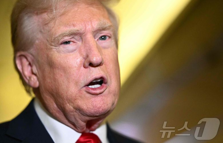도널드 트럼프 미국 대통령이 13일(현지시간) 플로리다주 팜비치에서 워싱턴 백악관으로 돌아 가기 위해 앤드루스 합동 기지로 향하는 전용기 내서 취재진을 만나 “국가 안보 관련 관세 조사에서 반도체와 전체 전자 공급망을 살펴볼 것”이라고 밝히고 있다. 2025.04.14 ⓒ AFP=뉴스1 ⓒ News1 우동명 기자