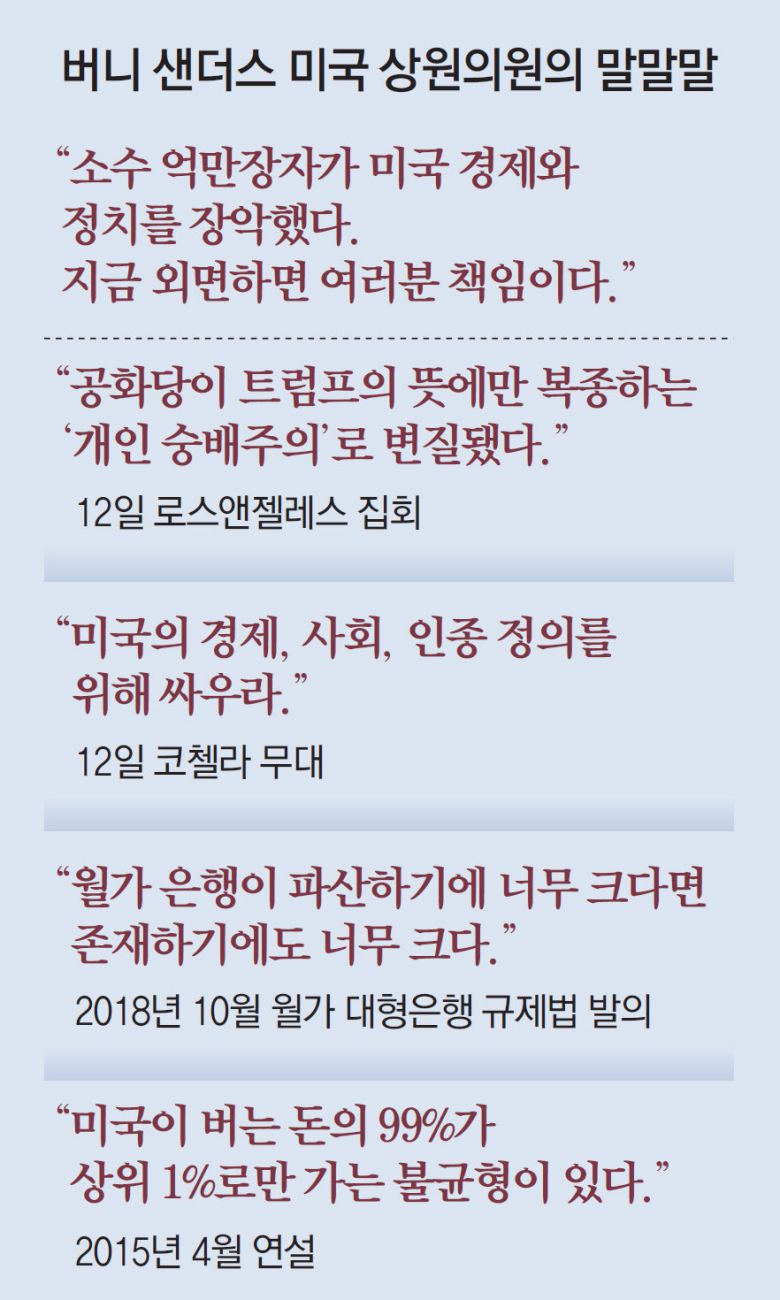 미국 민주당은 지난해 대선 패배 후 좀처럼 구심점을 찾지 못하고 있다. 이 와중에 샌더스 의원은 지난달 초부터 미 전역에서 ‘반(反)트럼프’ 집회를 열며 존재감을 드러내고 있다. 그는 트럼프 2기 행정부를 ‘과두(寡頭·oligarchy)정치’로 규정하며 “민주주의가 위험에 처했다”고 강조하고 있다.