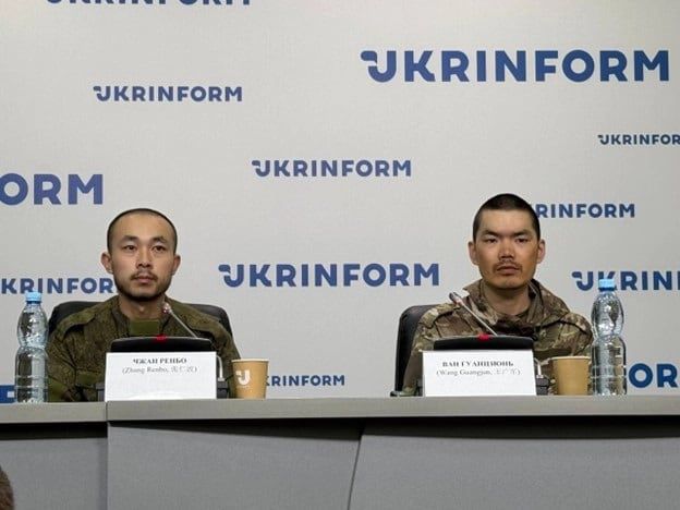 최근 우크라이나 동부 도네츠크에서 러시아군 소속으로 전투를 벌이다 우크라이나 군에 생포된 중국인 장런보(왼쪽)와 왕광쥔(오른쪽)이 14일 키이우에서 우크라이나 보안국(SBU)이 주최한 기자회견에서 외신 기자들의 질문에 답하고 있다. /우크린포름·키이우 포스트 제공