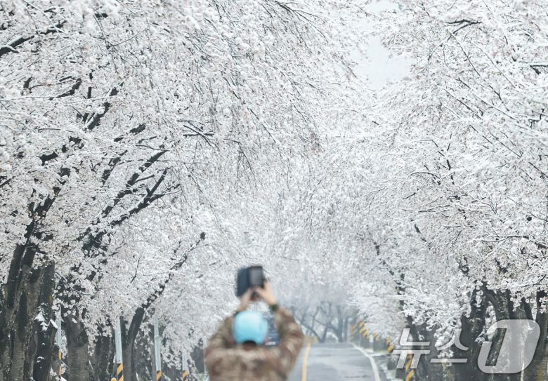 14일 경남 함양군 백전면 50리 왕벚꽃터널에서 밤새 내린 눈이 하얗게 쌓여있다. (함양군 제공. 재판매 및 DB 금지) 2025.4.14/뉴스1 |