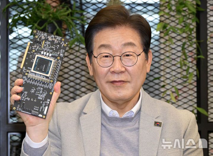 [서울=뉴시스] 국회사진기자단 = 이재명 더불어민주당 대선 예비후보가 14일 서울 강남구 퓨리오사AI에서 퓨리오사AI NPU칩을 들어 보이고 있다. 2025.04.14. photo@newsis.com |