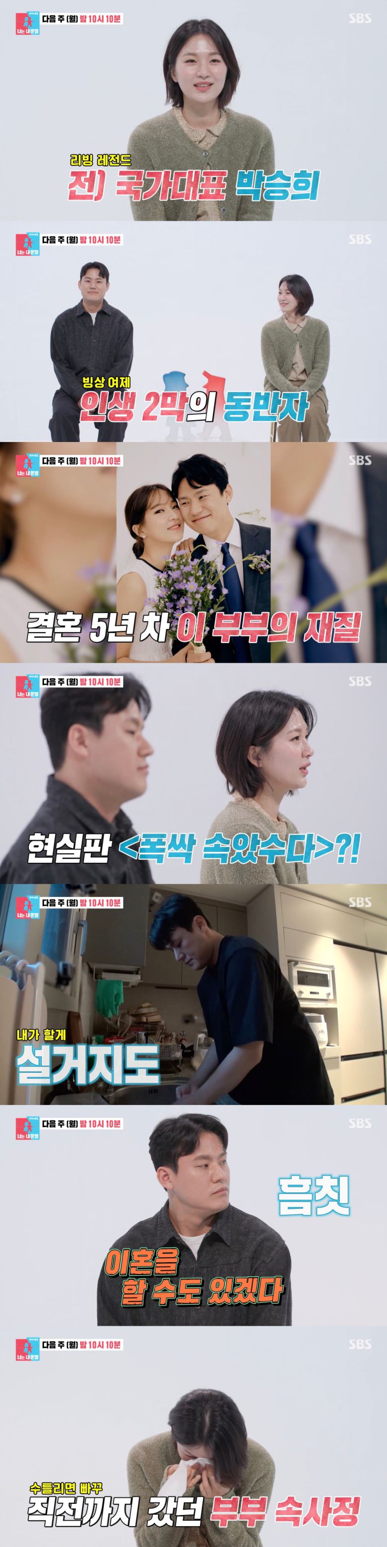 박승희는 "결혼 생활이 마음대로 잘 안 되더라. 이게 해결이 안 되면 이혼을 할 수도 있겠다는 생각까지 했다. 항상 그 문제 때문에 스트레스를 받았다"라며 두 사람 사이에 무슨 문제가 있음을 고백했다.
