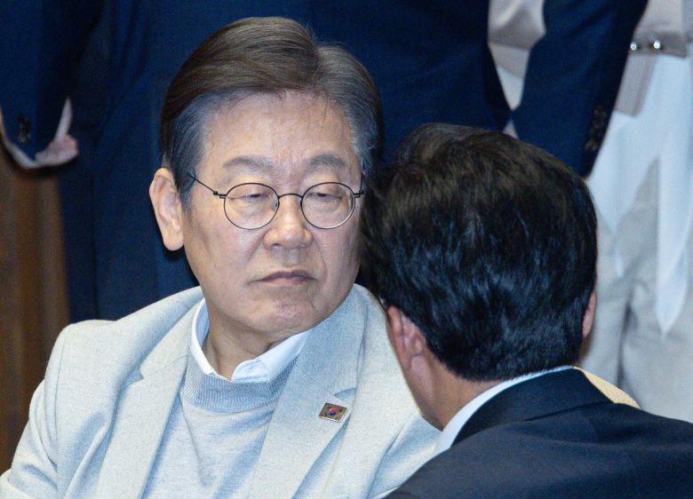 더불어민주당 이재명 대선 예비후보가 14일 오후 서울 여의도 국회에서 열린 제424회 국회(임시회) 제2차 본회의에서 같은 당 김민석 최고위원과 대화하고 있다. 뉴스1