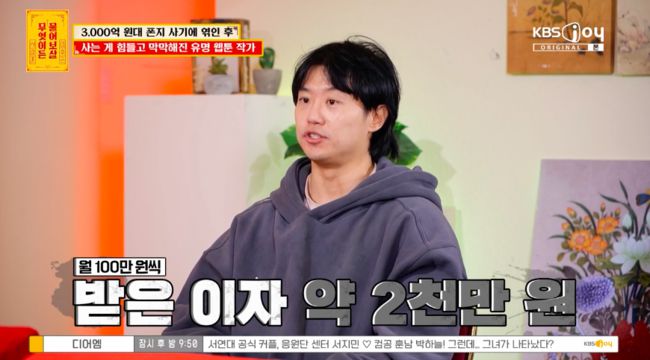 이날 방송에는 웹툰작가 겸 웹 소설 작가로 활동하고 있는 이광무 씨가 등장했다. 그는 “최근에 대한민국 폰지 다단계 사기 사건이 발생했다. 3천억 규모로 제가 그 사건에 피해자가 됐다. 피해금액 5,800만 원 정도다”라며 “현실감각이 없고, 앞으로 어떻게 해야 하고, 대처를 해야 할지 막막하다”라고 고백했다.