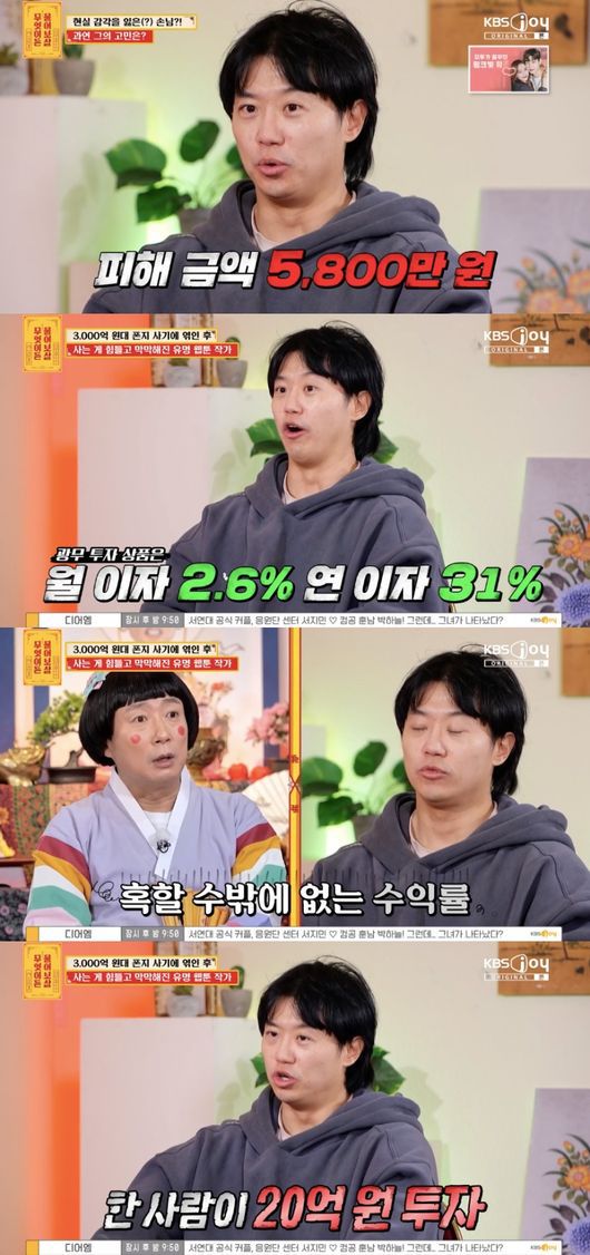 이수근 역시 “사기를 당한 이 과정을 웹툰으로 만들어서 공익성 있게 대박을 내는 건 어떠냐”라고 위로를 덧붙였다.