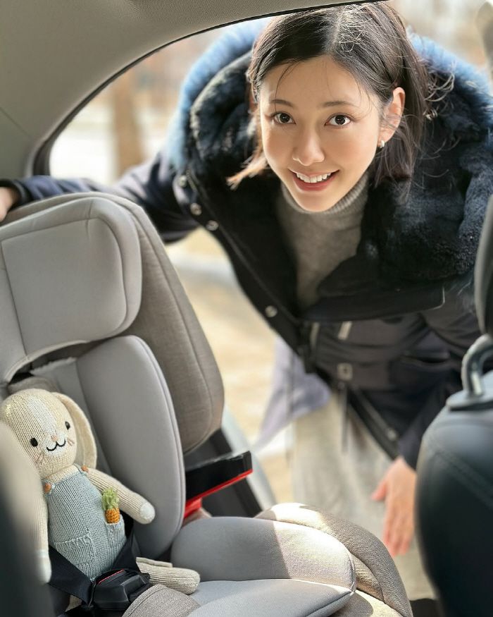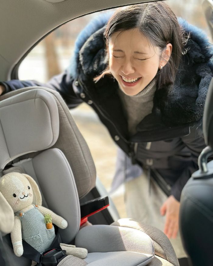 사진에는 차 안에 설치된 둘째 카시트를 보며 행복한 미소를 짓고 있는 나혜미의 모습이 담겨 있다. 둘째 대신 귀여운 인형을 대신 앉혀놓고 빵 터진 나혜미의 모습이 사랑스럽다.
