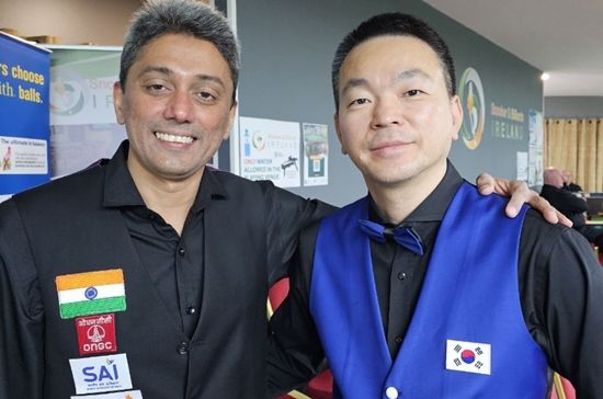 백민후가 14일(현지시간) 아일랜드 칼로우에서 열린 ‘2025 IBSF 세계잉글리시빌리어드챔피언십’ 16강 토너먼트에서 인도의 드르브 싯왈라에게 패해 8강 진출에 실패했다. 경기 후 두 선수가 포즈를 취하고 있다. (사진=대한당구연맹 이길남 심판위원장) |