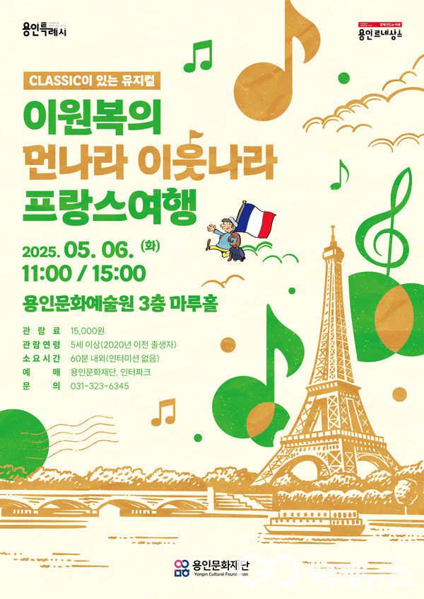 (용인=국제뉴스) 강정훈 기자 = 용인문화재단(이사장 이상일)은 오는 5월 6일 대체공휴일에 어린이들을 위한 특별 공연 '클래식이 있는 뮤지컬 <이원복의 먼나라 이웃나라 – 프랑스 여행>' 을 용인문화예술원 마루홀에서 개최한다.