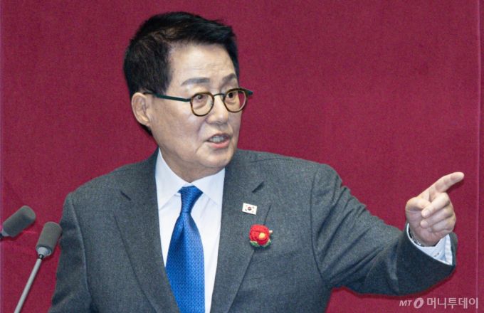 (서울=뉴스1) 이재명 기자 = 박지원 더불어민주당 의원이 13일 오후 서울 여의도 국회 본회의장에서 열린 제422회 국회(임시회) 제5차 본회의에서최상목 대통령 권한대행 부총리 겸 기획재정부 장관에게 경제 분야 대정부질문을 하던 중 국민의힘 의원들과 설전을 벌이고 있다. 2025.2.13/뉴스1  Copyright (C) 뉴스1. All rights reserved. 무단 전재 및 재배포,  AI학습 이용 금지. /사진=(서울=뉴스1) 이재명 기자